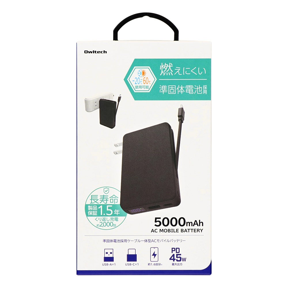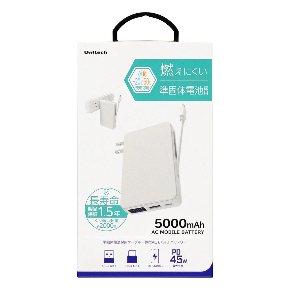 株式会社オウルテック(本社:神奈川県海老名市、代表取締役:山本哲也)は、準固体電池を採用した安心・安全・長寿命設計のモバイルバッテリー「OWL-LPBAC5003」シリーズを発売しました。USB Type-Cケーブルが内蔵され、AC充電器としても使えるため、普段使いや外出先などさまざまなシーンで活躍します。