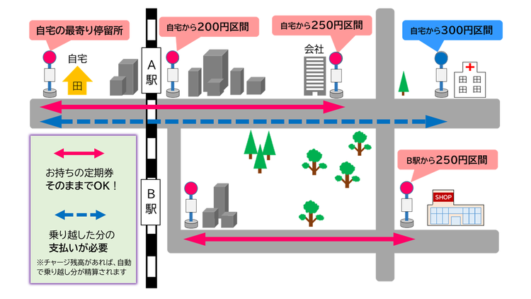 金額式定期券とは、購入時に設定された片道運賃以内であれば、どの区間・範囲でも利用できる定期券です。これまでの区間式定期券では利用できる区間を指定して購入し、乗り降りはその区間内に限られていましたが、金額式定期券であれば運賃範囲での乗り継ぎが可能となります。