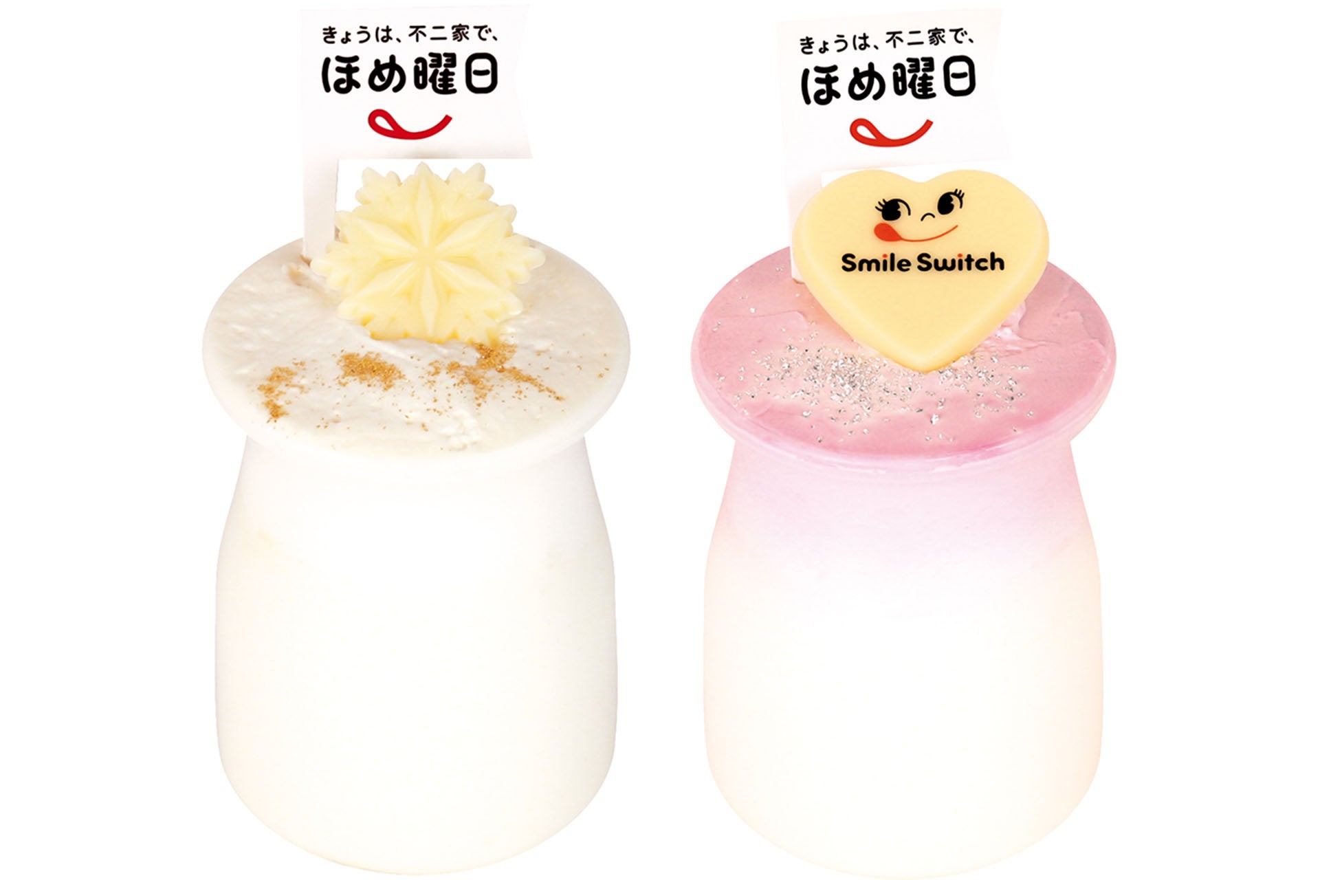 ミルキープリンにミルキーシャンテリーを重ね、上面に金粉と雪の結晶チョコを飾った「ご褒美ミルキープリン」と、ミルキープリンにストロベリーシャンテリーを重ね、銀粉とSmile Switchチョコを飾った「ご褒美苺ミルキープリン」の2種が登場。「ほめ曜日」フラッグを立てたご褒美プリンです。