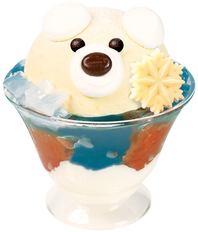 バニラムースにパチパチはじけるキャンディ入りのラムネ風ゼリーを重ね、白くまに見立てたバニラムース、グレープフルーツシロップ漬け、星形ナタデココ、雪の結晶チョコを飾りました。流氷の中から顔を出す姿をイメージしたキュートな白くまパフェです。