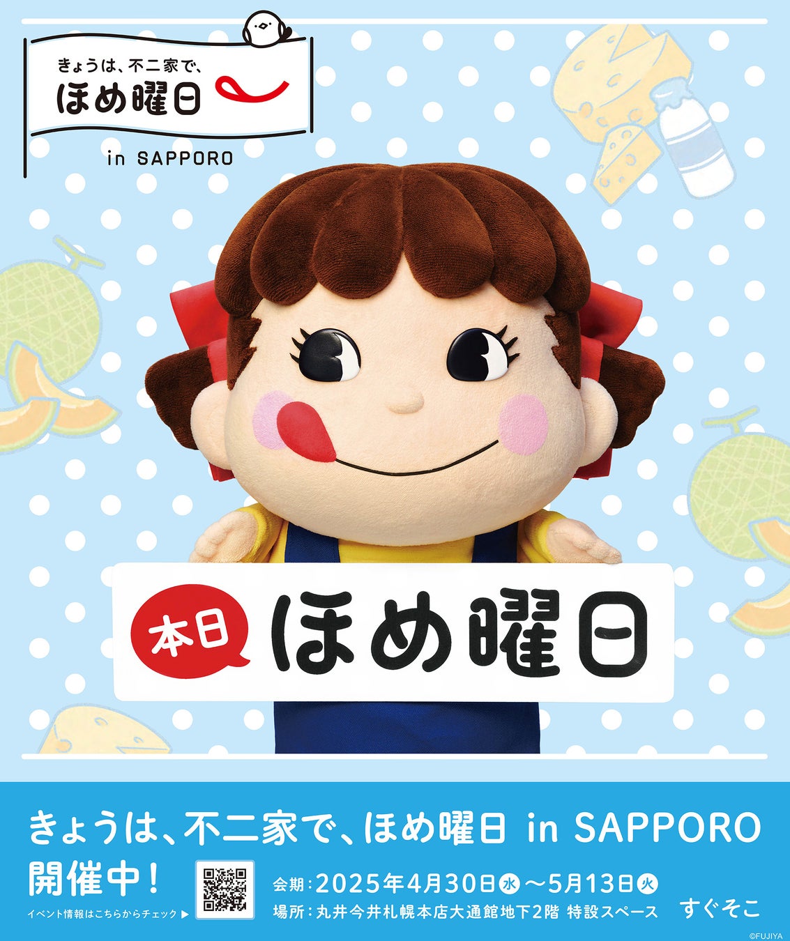 催事会場では、不二家洋菓子店のCMにちなみ「きょうは、不二家で、ほめ曜日」と題し、<頑張った日も、頑張れなかった日も、1週間に1度くらい自分にご褒美をあげよう!>をテーマにした企画を展開します。本催事限定スイーツのほか、東京や大阪でご好評いただいたペコちゃんグッズを札幌でもご用意いたします!