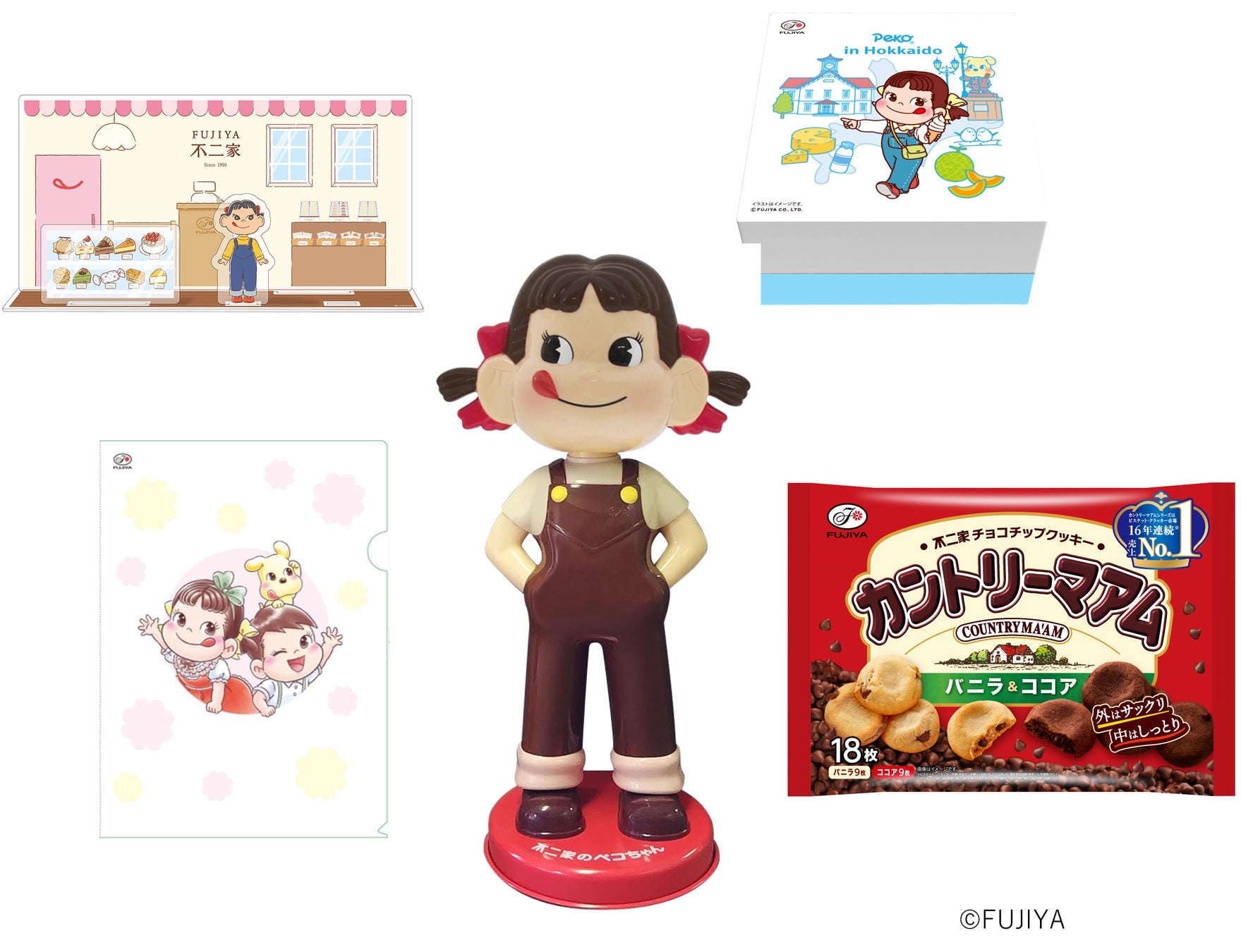ブラウンカラーのオーバーオールを着た「卓上ペコちゃん人形」が北海道に初登場! 西洋菓子舗 不二家 丸井今井札幌本店限定の「北海道×ペコちゃん プレミアムミルキーバターサンド(5個入)」のほか、ペコちゃんグッズを詰め合わせたお得なお楽しみ袋が数量限定で登場します。
