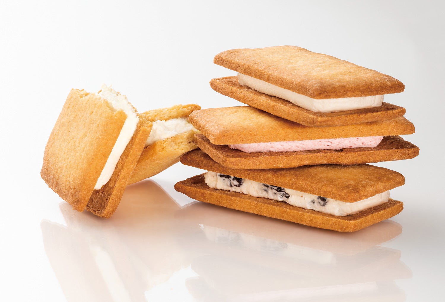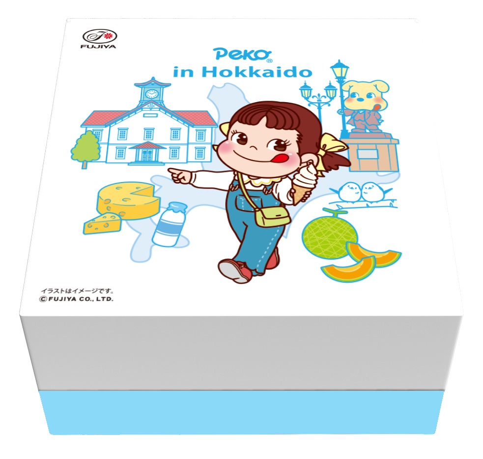 北海道を訪れたペコちゃんと、北海道の名所や名物をデザインしたオリジナルBOXに、西洋菓子舗 不二家の人気商品「プレミアムミルキーバターサンド」を5個詰め合わせました。定番フレーバーのプレーン、福岡県産あまおう苺、カリフォルニア産レーズンなどの人気フレーバーを詰め合わせました。