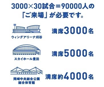 昨シーズン、WA刈谷で3,000人を超えたのは3試合のみ。全席完売でも、チケット購入者のうち実際に来場されるのは平均88%の方で、3,000人を超えることは簡単ではありません。