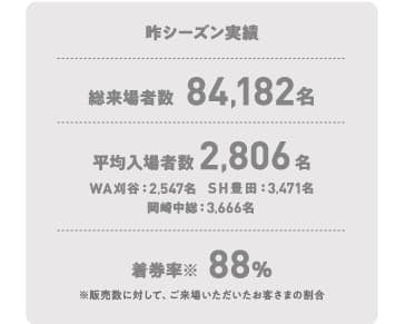 2022-23シーズンの総入場者数は、84,182人、平均2,806人。(WA刈谷:2,547人、SH豊田:3,471人、岡崎中総:3,666人)。