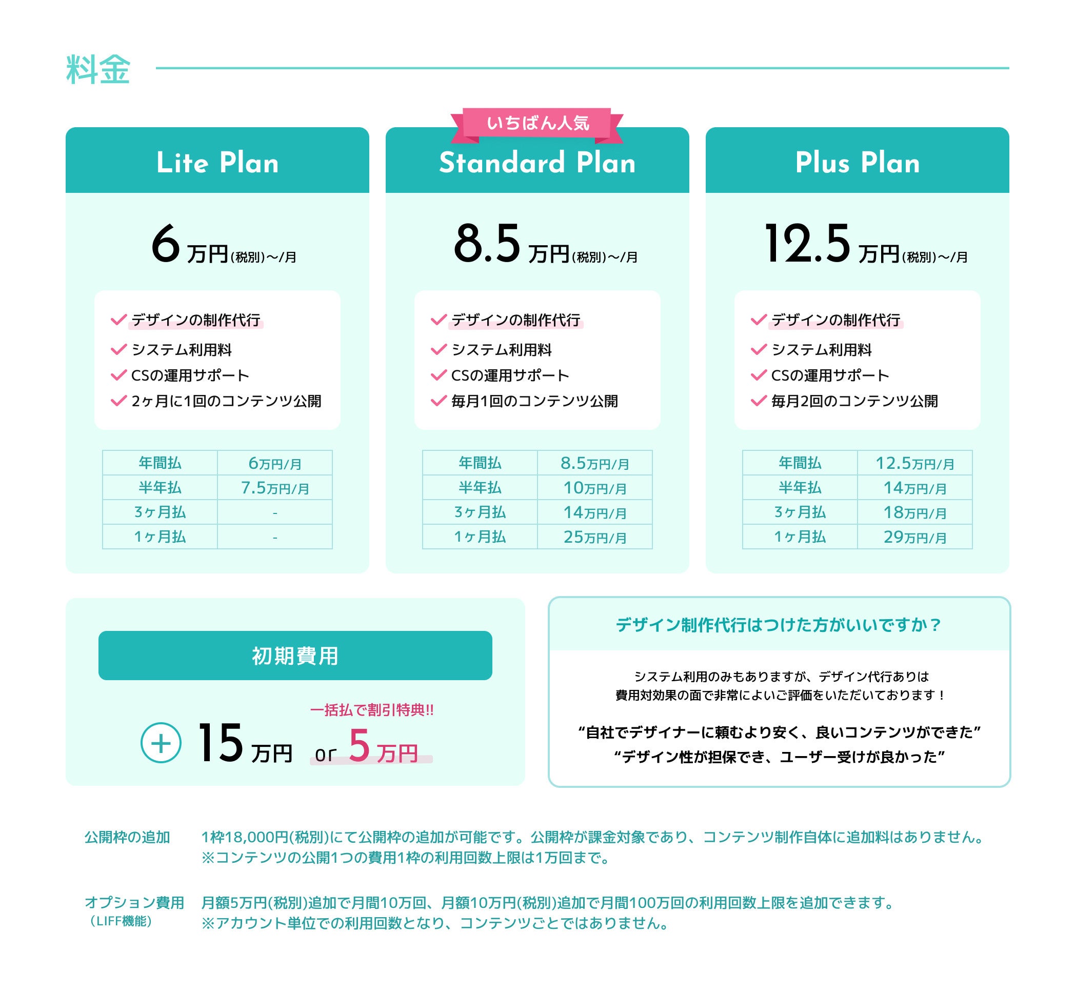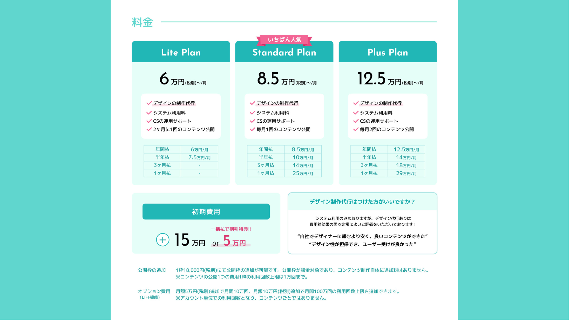 Lite:デザイン制作代行/システム利用料/CSサポート/2カ月に1回のコンテンツ公開