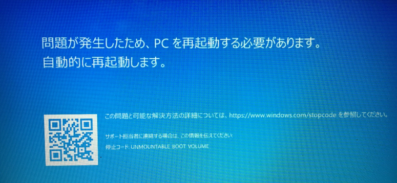 「Unmountable Boot Volume」エラーは、Windows起動時によく発生する青い画面のエラーで、「停止コード」にUnmountable Boot Volumeと表記されます。このエラーはWindowsの起動に必要なディスクに問題がある場合に表示されます。