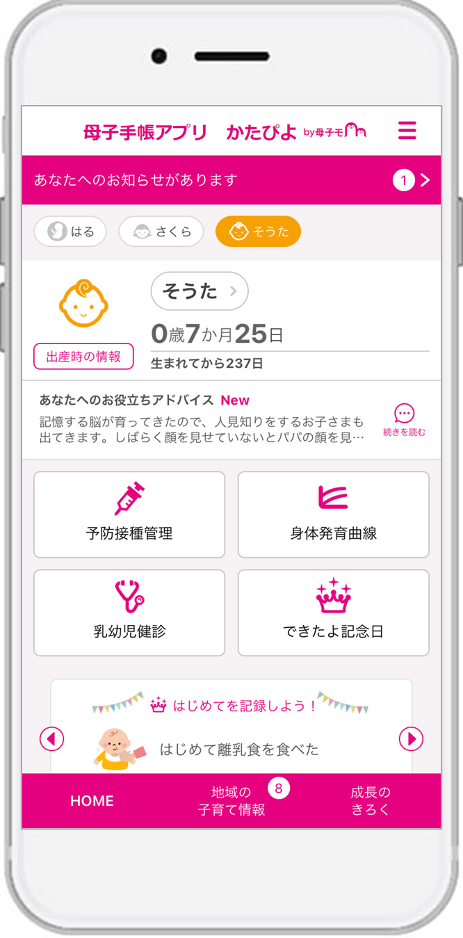 群馬県片品村に採用された『母子手帳アプリ かたぴよ』は、スマートフォン・タブレット端末・PCに対応したサービスで、妊産婦と子どもの健康データの記録・管理や予防接種のスケジュール管理、出産・育児に関するアドバイスの提供、離れた地域に住む祖父母など家族との共有機能や、村が配信する地域の情報をお知らせするなど、育児や仕事に忙しい母親や父親を助けてくれる便利な機能が充実しています。