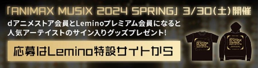 Lemino プレミアム会員とd アニメストア会員の方を対象に、「ANIMAX MUSIX 2024 SPRING」に出演するアーティストのサイン入りオフィシャルグッズのプレゼントキャンペーンを実施します。この機会にぜひ、Lemino プレミアムとd アニメストアにご入会ください。詳細はLemino特設サイトをご確認ください。