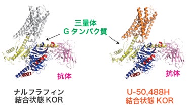 2種類の作動薬(ナルフラフィン *6/U-50,488H *7)による受容体活性化の立体構造を可視化し、シグナル分岐の起点となるアミノ酸残基を同定
