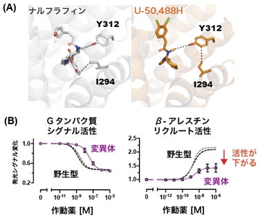 明治大学理工学研究科 光武亜代理准教授、学校法人関西医科大学(大阪府枚方市 理事長・山下敏夫、学長・木梨達雄)医学部医化学講座 清水(小林)拓也教授、寿野良二准教授、名古屋工業大学生命・応用化学類 片山耕大准教授、神取秀樹特別教授、京都大学大学院薬学研究科・東北大学大学院薬学研究科井上飛鳥教授(京都大学/東北大学)、筑波大学国際統合睡眠医科学研究機構 斉藤毅准教授、大阪大学蛋白質研究所 加藤貴之教授らの共同研究グループは、ヒトκオピオイド受容体のバイアスドシグナリング機構を従来より詳細に解析し、新たにシグナル選択性に関与するアミノ酸残基を同定しました。