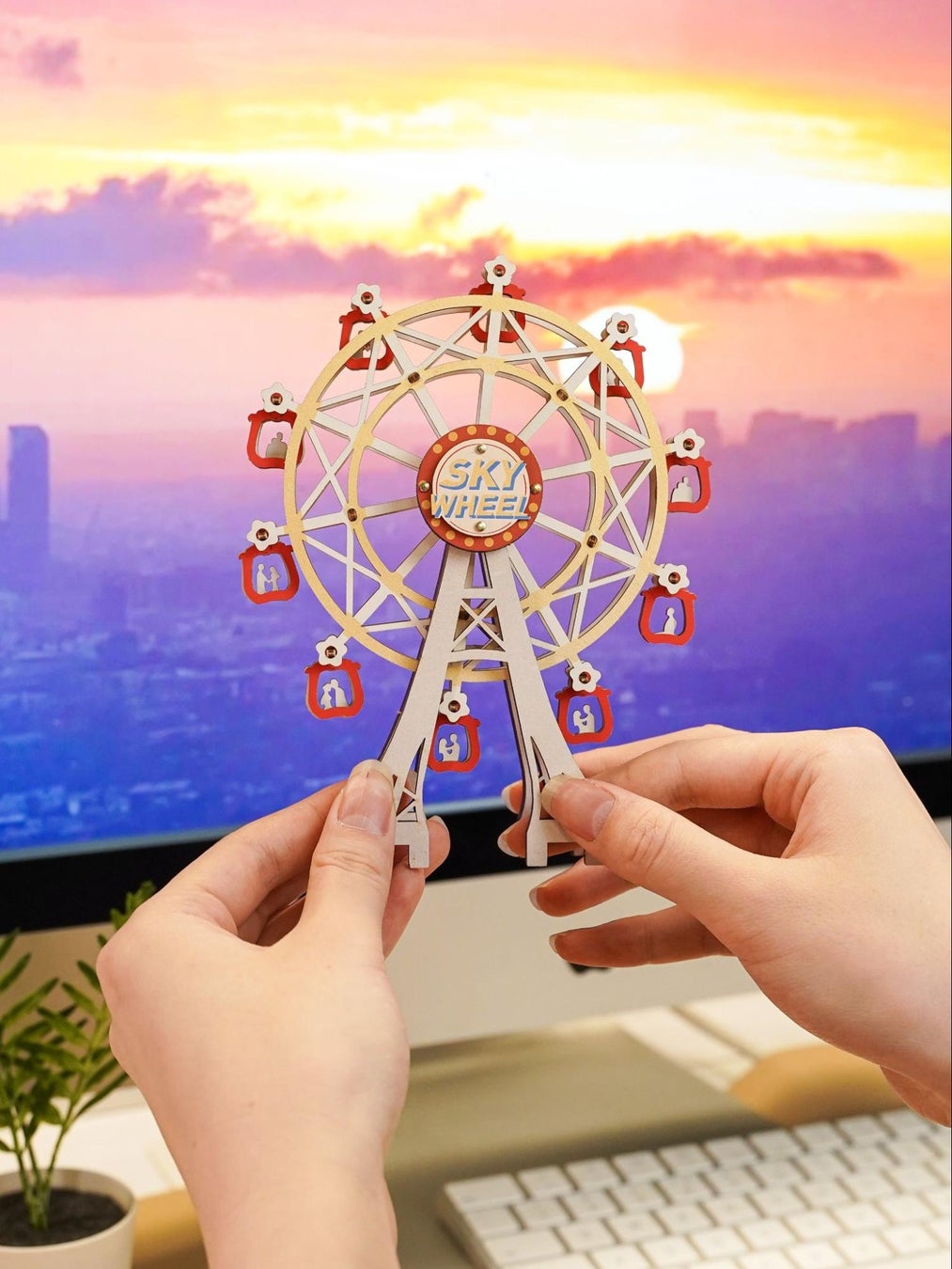 『サンセットパーク』は、昔なつかしいテレビを彷彿とさせるレトロなデザインが魅力的なウッドパズル。パズル裏面には、USBポート(type-C)が付いており、音楽が流れ光ったり、パーツが動くなどの仕掛けがたくさんあります。