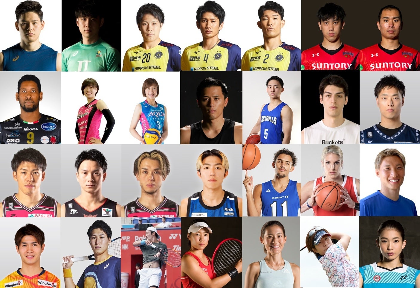 バレーボール:西田有志、小野寺太志、山本智大、髙野直哉、樋口裕希、大宅真樹、鶴田大樹、ウィルフレド・レオン、間橋香織、佐々木千紘/バスケットボール:富樫勇樹、河村勇輝、シェーファー アヴィ 幸樹、岡田侑大、保岡龍斗、伊藤駿、津屋一球、寺嶋恭之介、トレイ・ヤング、エレーナ・デレ・ダン/サッカー:畠中槙之輔、佐藤亮/テニス:綿貫陽介、伊藤竜馬、日比野菜緒/マラソン:岩出玲亜/ゴルフ:穴井詩/バドミントン:松友美佐紀 他アスリート・チーム多数