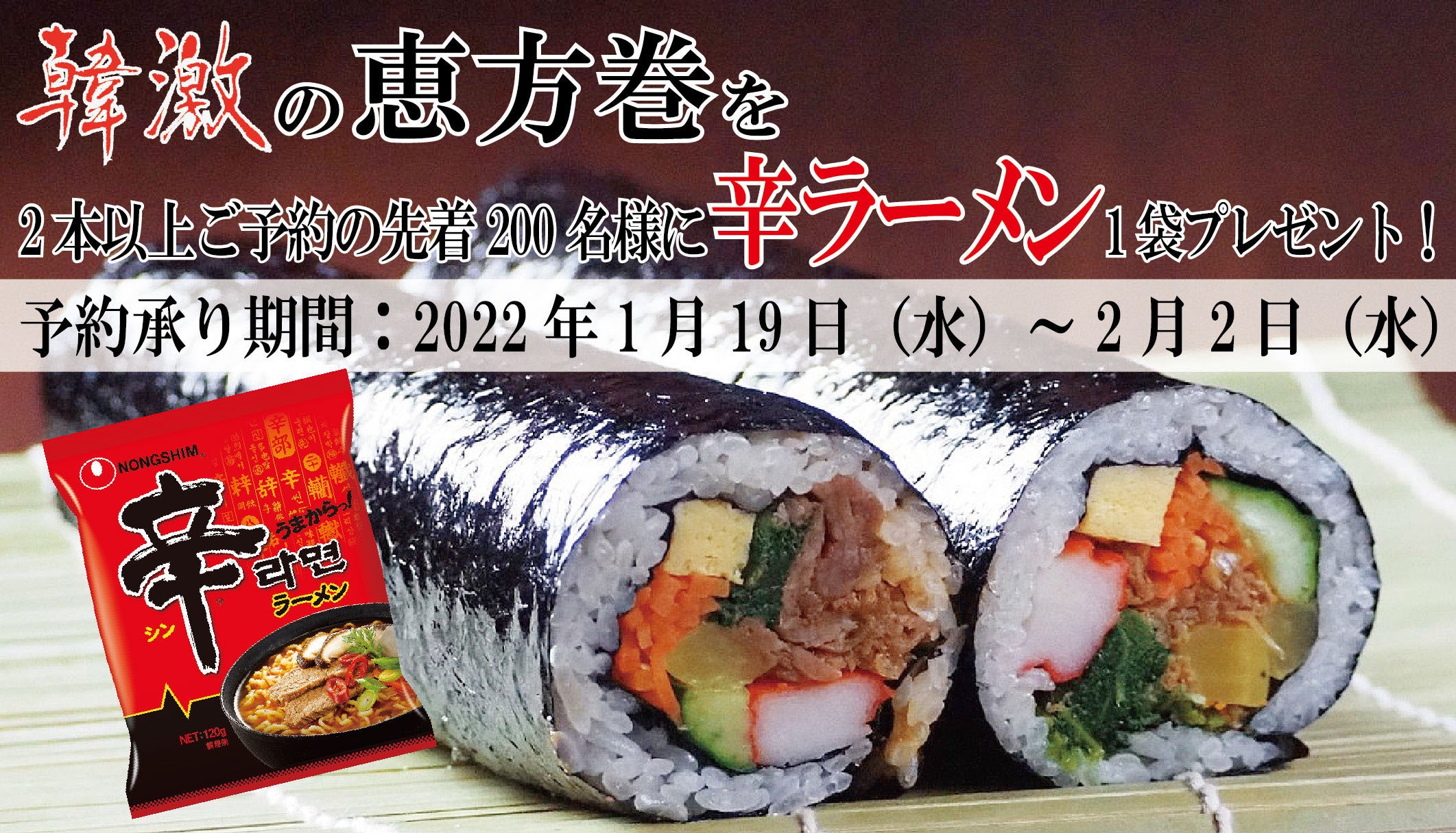 恵方巻を2本以上ご予約すると先着200名様に「辛ラーメン」をプレゼント~2022年の節分は「韓激の恵方巻」と「辛ラーメン」で~