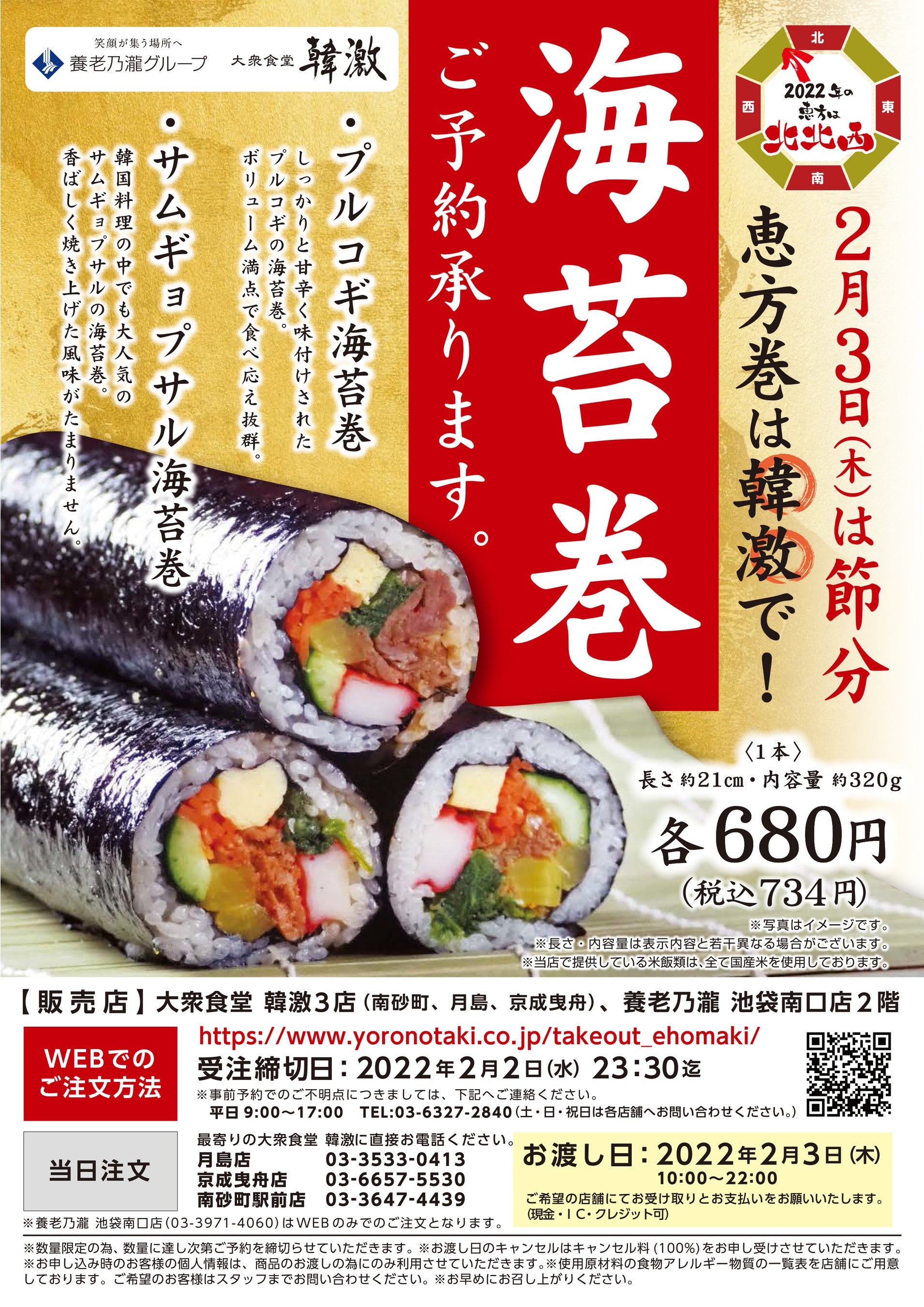 対象:韓激の恵方巻(プルコギ海苔巻・サムギョプサル海苔巻)を