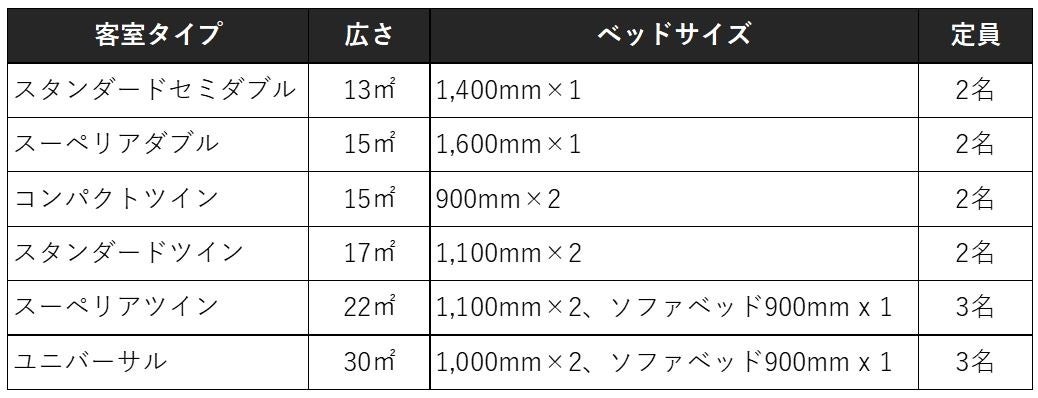 【客室】シンプルで機能的な6タイプ。開業記念の特別料金プランもあります。※料金は変動するので公式サイトでご確認ください。