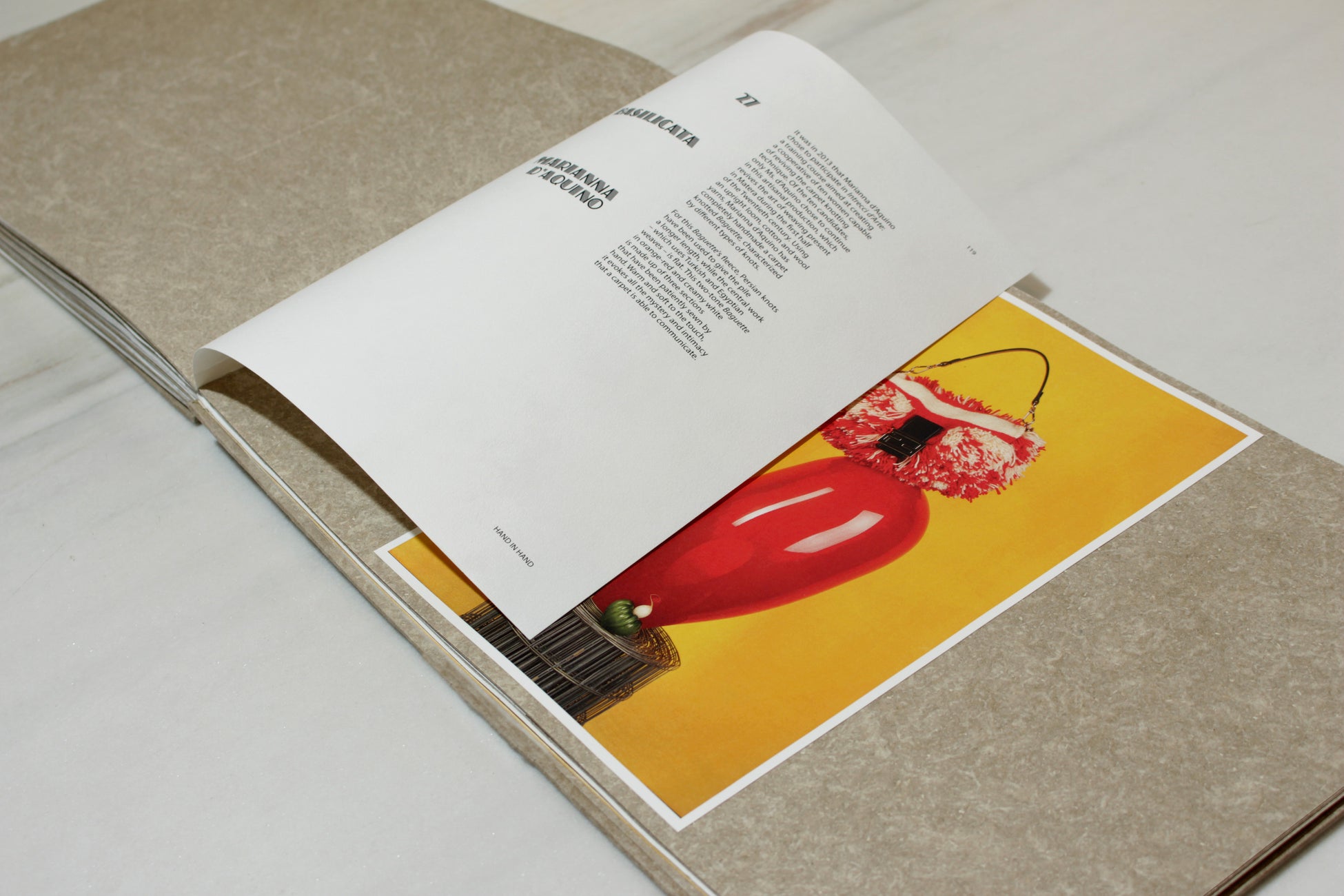 ブックの中のインタビューで、シルヴィア・フェンディは次のように述べています。「変わらずに続いてきたと思われる 技法に取り組み、手作業をしているときに、どのようにすればエラー(間違い)がむしろ美点に転じるのか観察するのは楽しいものです。実際、それらがイノベーションのアイデアとなることがあります。これこそが今日のクチュールだと思います。フェンディの「ハンド・イン・ハンド」は、クチュールのためのプロジェクトです。なぜならそれによって「バゲット」バッグは復刻されるのではなく、ユニークなアイテムの限定的なシリーズとして提示されるのですから。フェンディ「ハンド・イン・ハンド」は、地方の伝統、熟練の職人の仕事を維持し、次世代にその技能を伝えることを目的とするプロジェクトです。とりわけ、サステナビリティは、人としての責任、透明性、市民社会への敬意を必要とするのです」