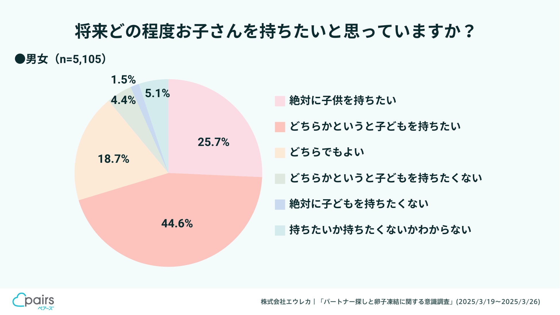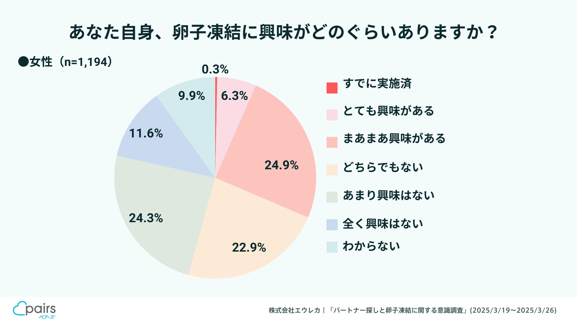 恋活・婚活マッチングアプリ「Pairs(ペアーズ)」を運営する株式会社エウレカ(本社:東京都港区、代表取締役CEO:山本竜馬、以下 ペアーズ)は、「パートナー探しと卵子凍結に関する意識調査」を実施しました。株式会社グレイスグループ(本社:東京都渋谷区、代表取締役CEO 勝見祐幸、以下 グレイスグループ)と共同で調査内容を企画したもので、男女別に集計した結果を2025年4月23日に公開しました。