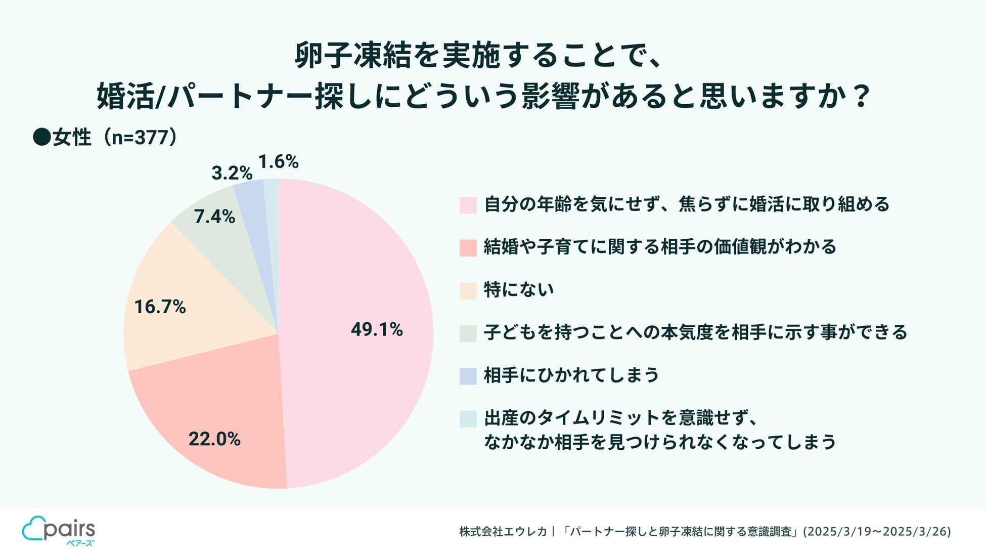 最後に、女性に対して「卵子凍結を実施することで、婚活/パートナー探しにどういう影響があると思いますか?」という質問をしたところ、「自分の年齢を気にせず、焦らずに婚活に取り組める」が49.1%と約半数を占め、卵子凍結がマイペースな恋愛・婚活を後押ししていることがわかりました。