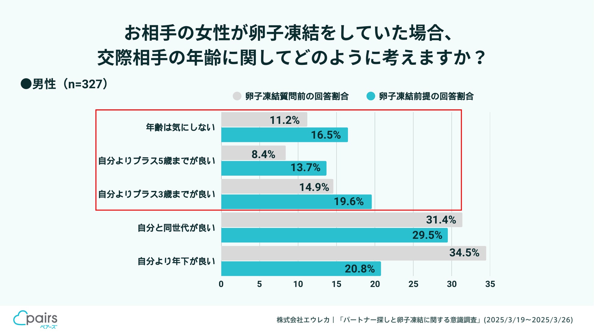 男性に対しては、調査の冒頭に「交際相手の年齢に関して、どのように考えていますか?」と質問した後に、卵子凍結に前向きな考えを持つ方に卵子凍結に関する仮定を加えて質問し、同じ回答項目で結果を集計、比較しました。これによると、「年齢は気にしない」「自分よりプラス5歳までが良い」「自分よりプラス3歳までが良い」の回答割合がいずれも約5%前後伸長しました。