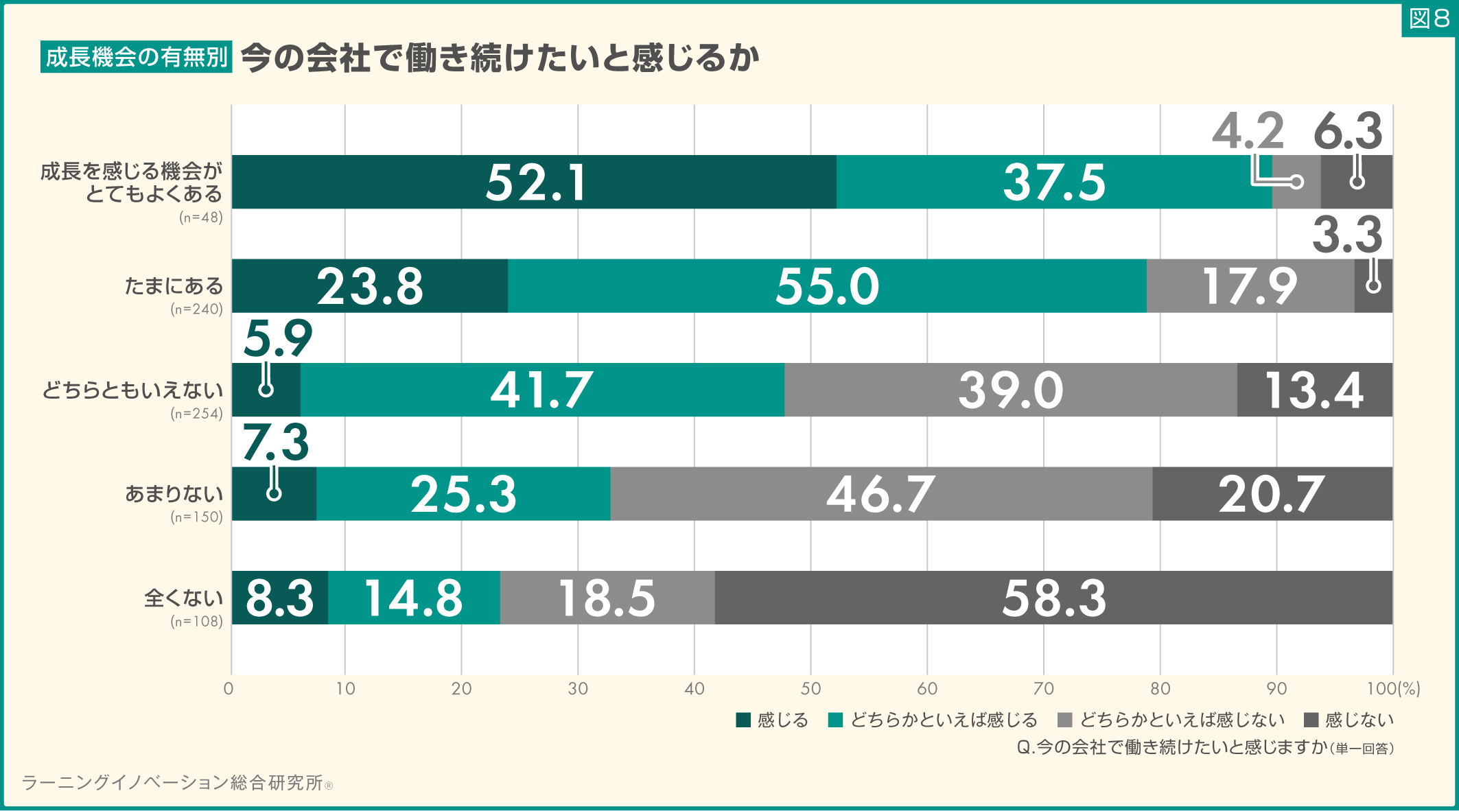 勤続意向、成長機会が「よくある」群は5割超。成長機会「全くない」群は1割を下回る(図8)