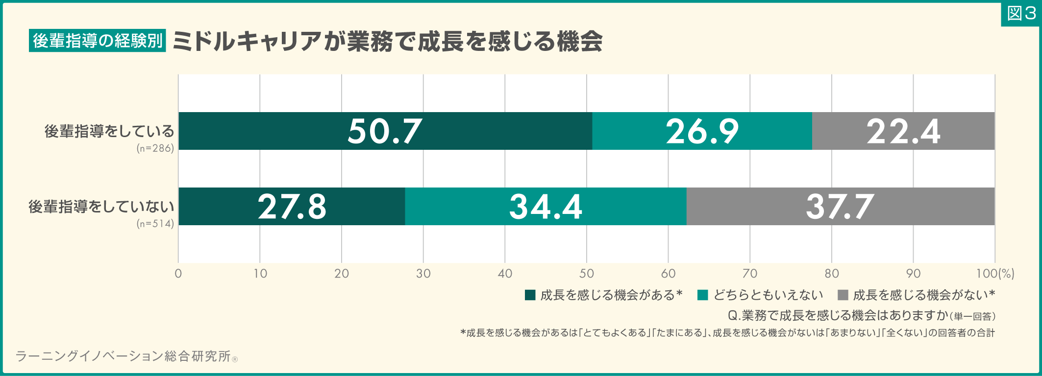 後輩指導をしているミドルキャリアのほうが、成長を感じる機会がある傾向が見られました(図3)。