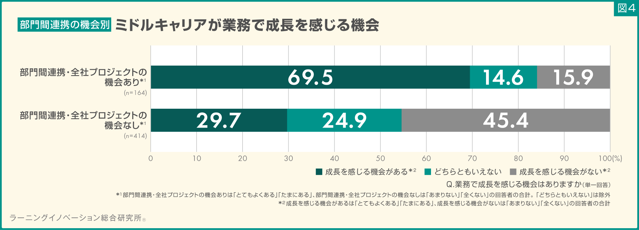 部門間連携の機会があるミドルキャリアのほうが、成長を感じる機会がある傾向が見られました(図4)。