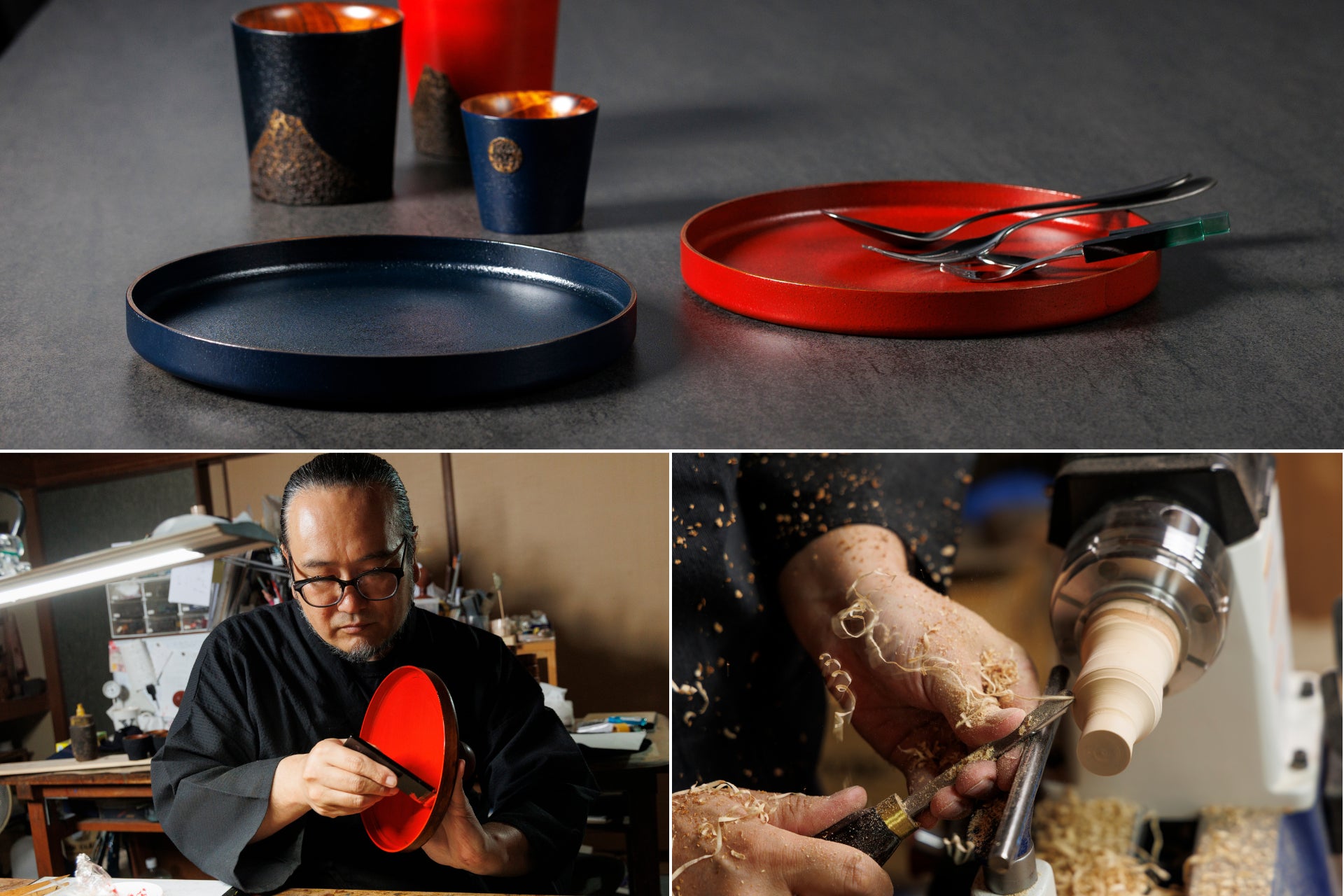 香川漆器の伝統技を現代のライフスタイルに昇華。香川名産「庵治石」を用いた独自技法“石粉塗”により、ナイフやフォークの使用にも耐える丈夫さを実現。また、塗りなどの加飾だけでなく、器の木地づくりから手がける作家・松本光太氏による完全ハンドメイド。上品なリムデザインが食卓に寄り添う、新しい漆器のかたちです。