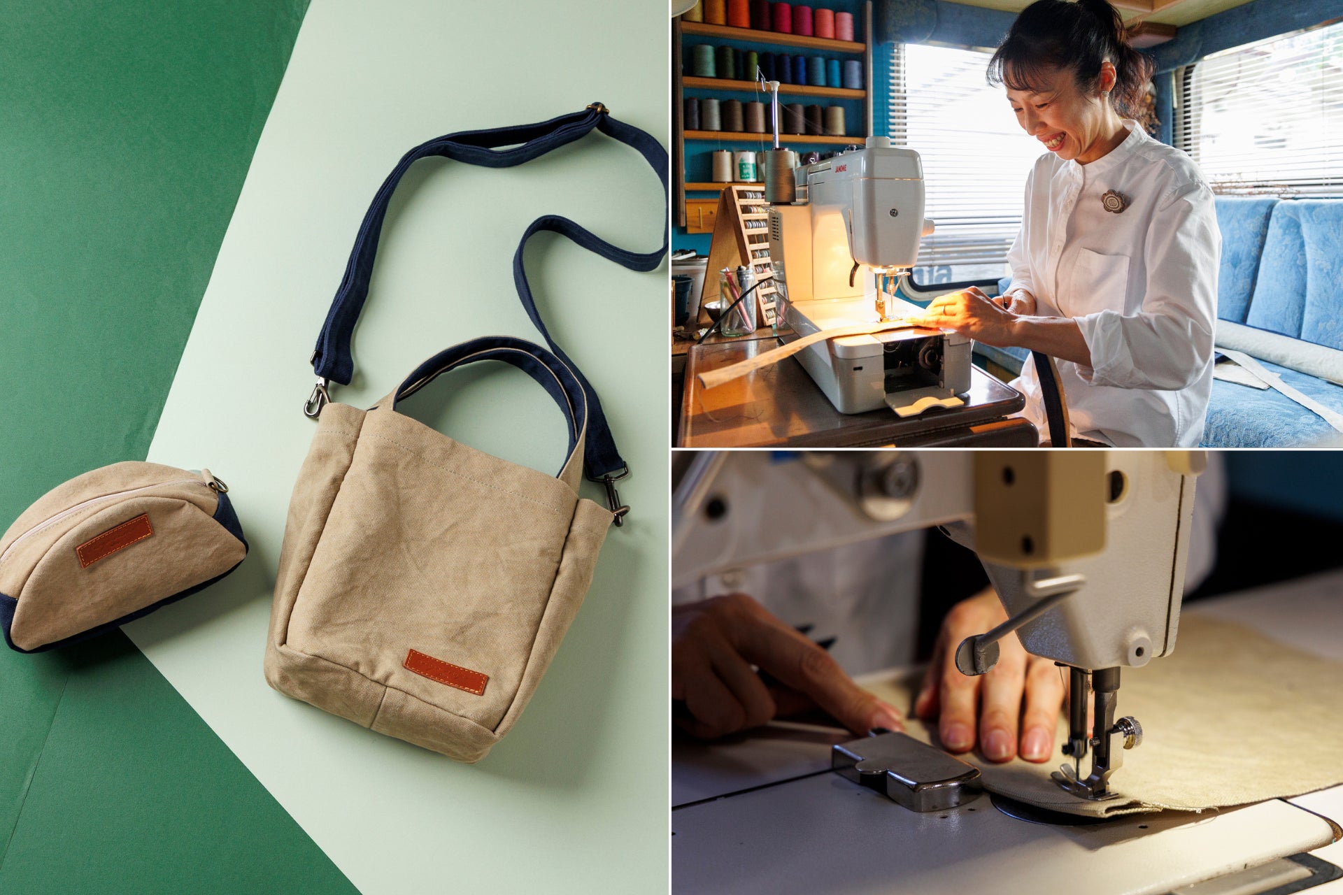 「香川」にこだわり、小豆島産オリーブの葉と讃岐山脈の湧水で染め上げた天然染めの「オリーブ帆布」を使用。夫婦二人が手間を惜しまず一つひとつ丁寧に作り上げるバッグは、手にした瞬間からまるで昔から愛用しているかのような温かみを感じられます。香川の自然の息吹をまとった、ツートーン&リバーシブル仕様の特別オーダーバッグです。