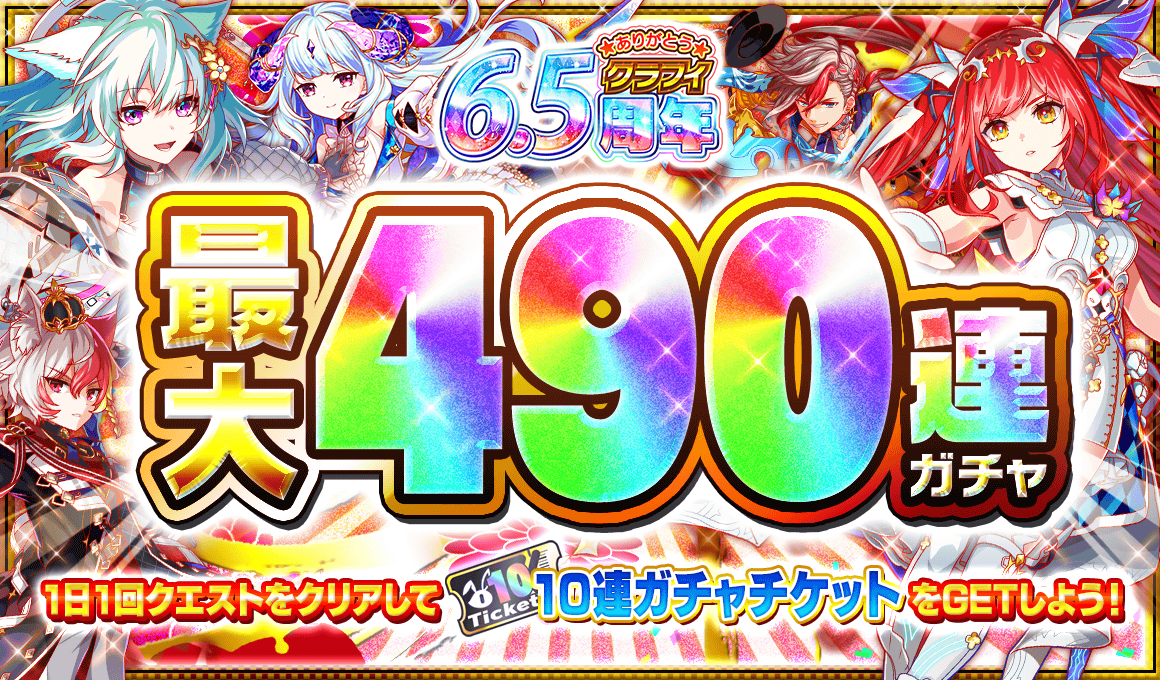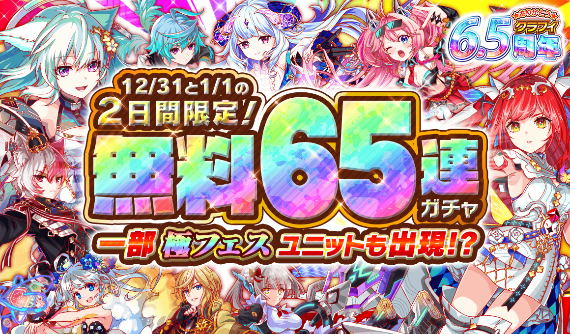 6.5周年イベントでは新たなユニットの実装や豪華報酬のログインボーナス、ミッション、交換所をご用意!ハッピーガチャ最大1000連分のハッピーガチャチケットが入手可能!