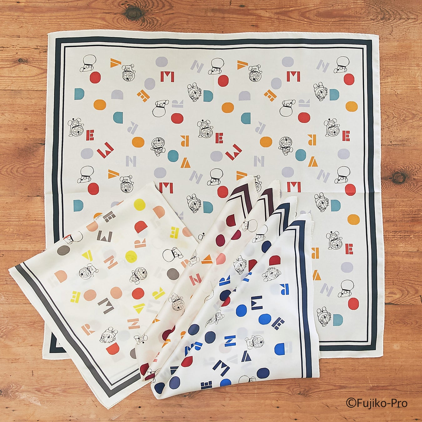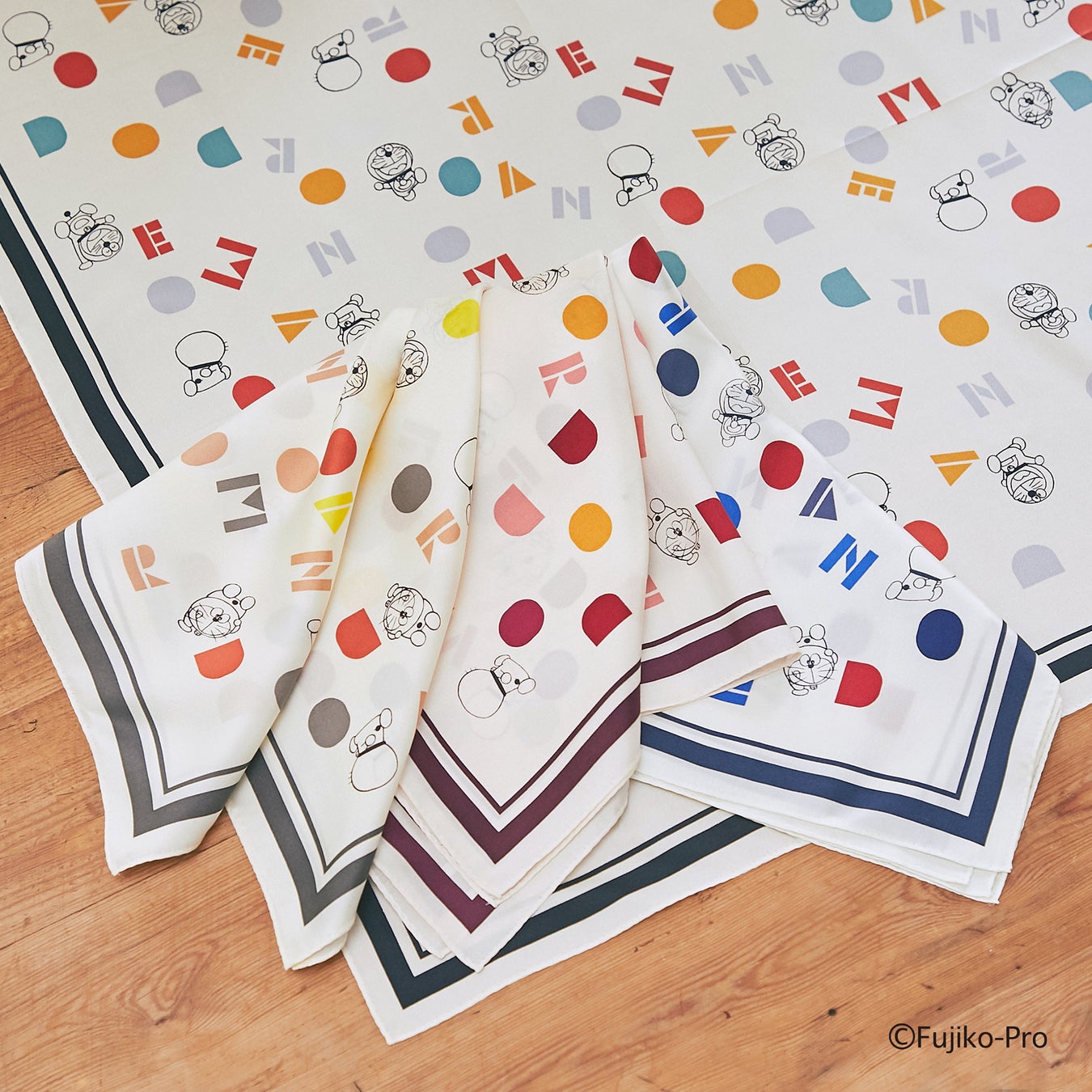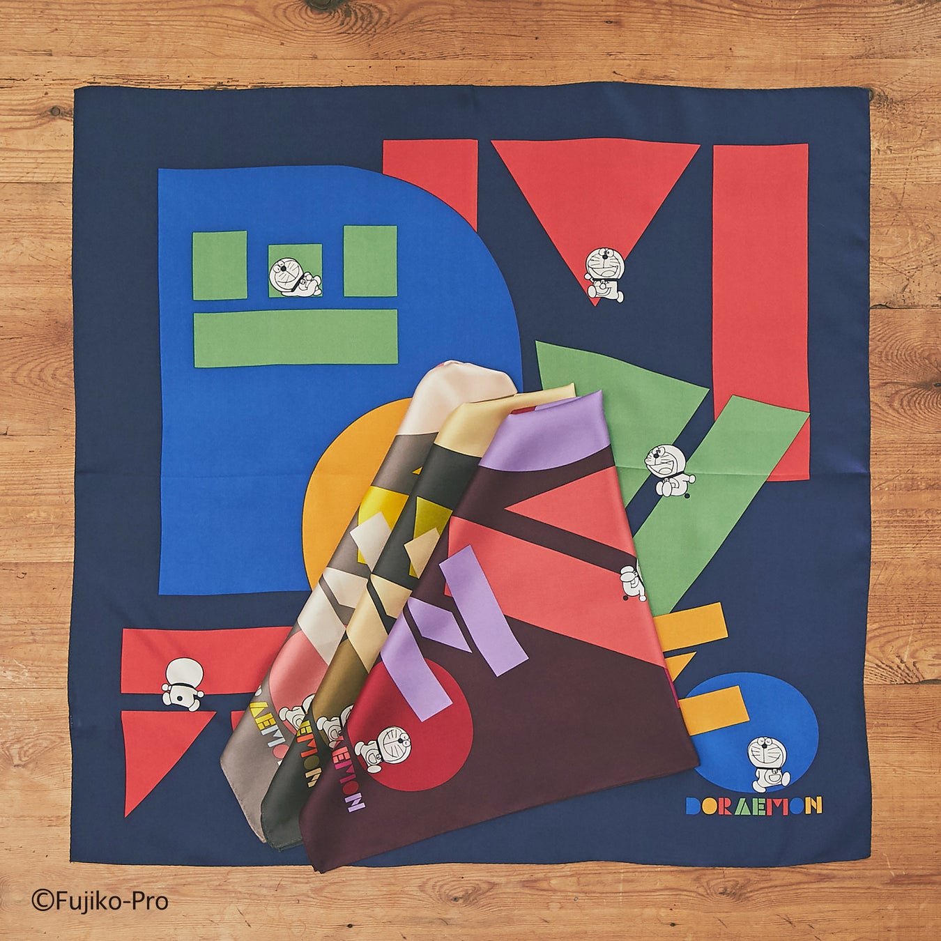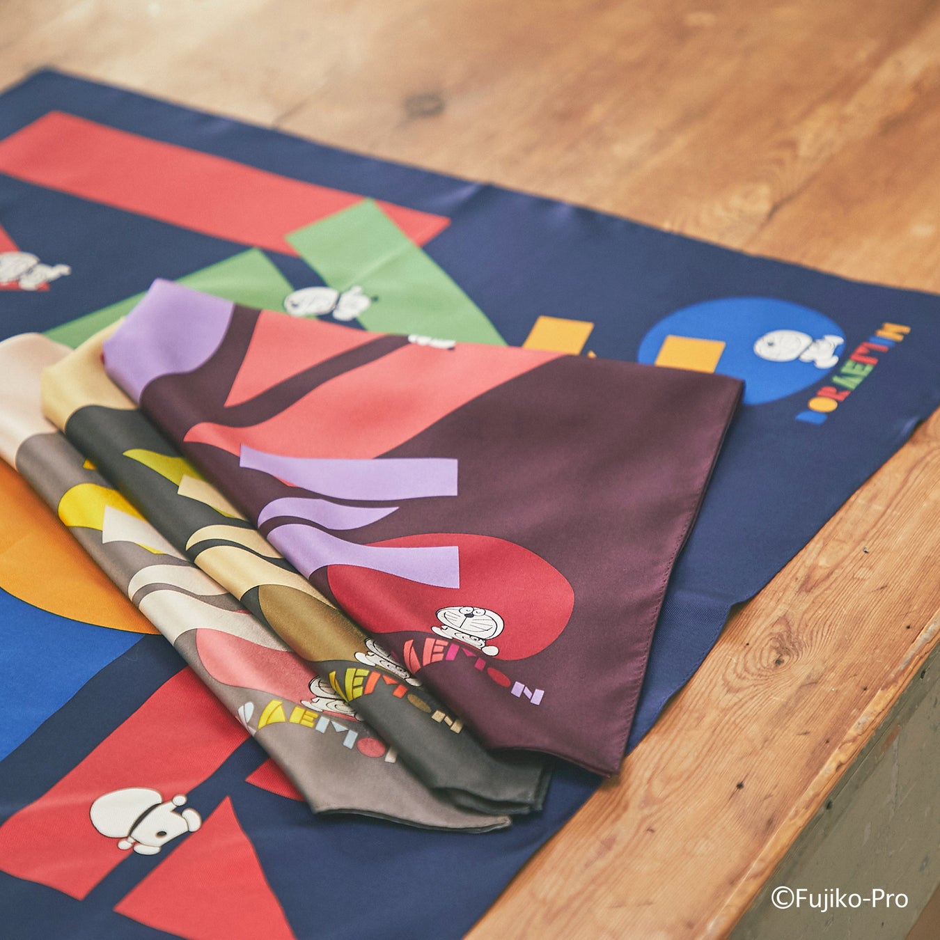 ドラえもんとジオメトリックパターンを組み合わせたプチスクエアスカーフで、ポップでキュートなデザインから、レトロシックで大胆なデザインまで、思わず”かわいい”とこころが楽しくなるアイテムの登場です!