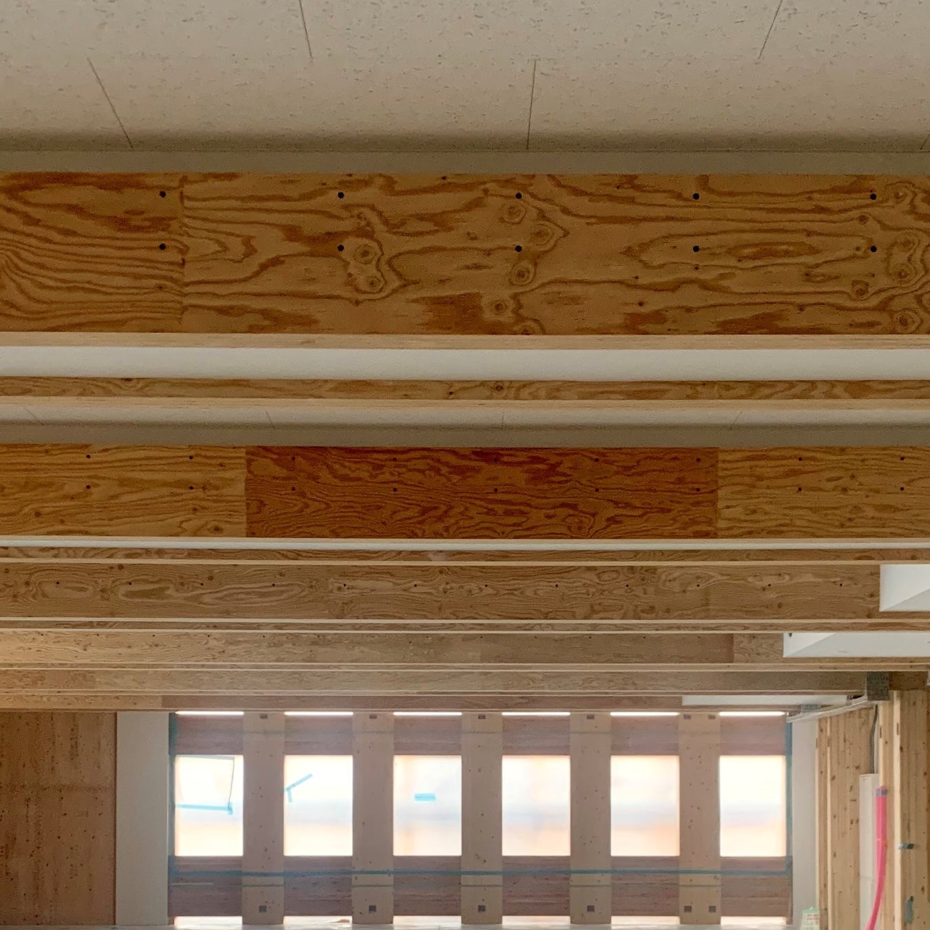 中大規模木造建築物としては2棟目となるアキュラホームつくば支店オフィス棟(茨城県つくば市)を建築。グッドデザイン賞2018受賞。同建築物は、サスペンション梁と呼ばれる屋根が特徴。東西方向に吊屋根状の曲線をなし、60mm×120mm ヒノキ 4m 材を交互にずらしながらビス止めすることにより、張力と曲げ剛性をバランスよく発揮。これにより、風圧による吹き上げや、偏荷重に対する安定性を確保。2 階事務所スペースはサスペンション梁によって 9m×14m の無柱空間を、1 階の多目的ホールは斜め壁を耐力壁として設計することで、7m×10m の無柱空間を実現。目的に応じてさまざまなレイアウトを可能としています。特別な金具(ワイヤーや鉄骨で固定するのが一般的な手法)を一切使用せずに、一般大工による施工で実現した建築物は日本初の事例。