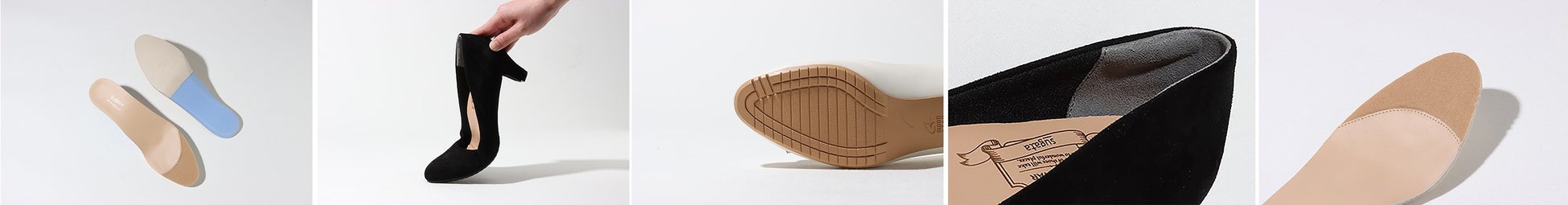 アウトソールは中央部にくぼみを持つ独自開発の形状で安定性に優れています。ヒールなのに安定し、背筋も自然にスッと。