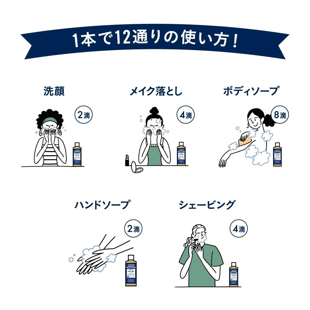 マジックソープの心地よさを生活の様々なシーンで。1本で12通りの使い方!