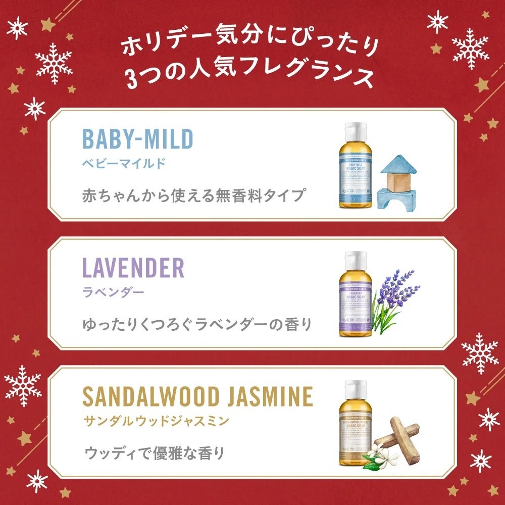 今年はベビーマイルド、ラベンダー、サンダルウッドジャスミンの3本セット。天然精油やエキスの自然な香りに気分がほぐれ、ホリデーシーズンのバスタイムにおすすめです。