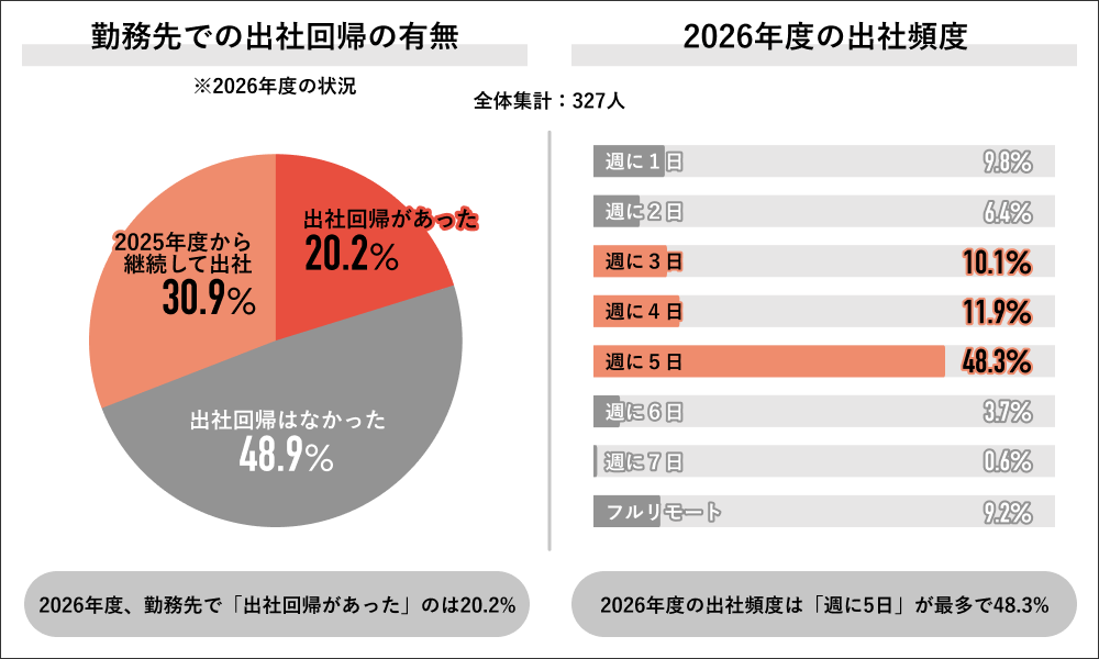 回答者全体の327人に、2026年度勤務先での出社回帰の有無を聞くと、「あった」が20.2%となり、次いで「2025年度から継続して出社」が30.9%でした。また、2026年度の出社頻度を聞くと、「週に5日」が48.3%で最多となり、次いで「週に4日」が11.9%、「週に3日」が10.1%となりました。