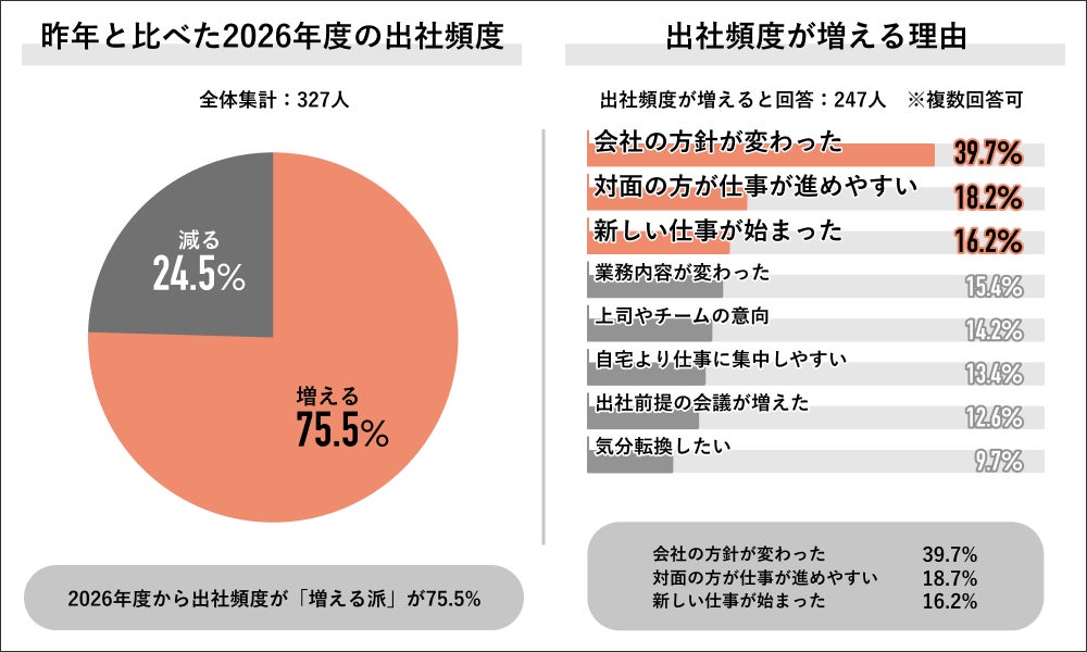 ・全体の75.5%が2026年度から出社頻度は「増える」 背景は「会社の方針が変わった」が最多