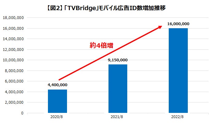 ② テレビ機器に紐づくモバイル広告ID数が440万IDから1,600万IDと約4倍に増加