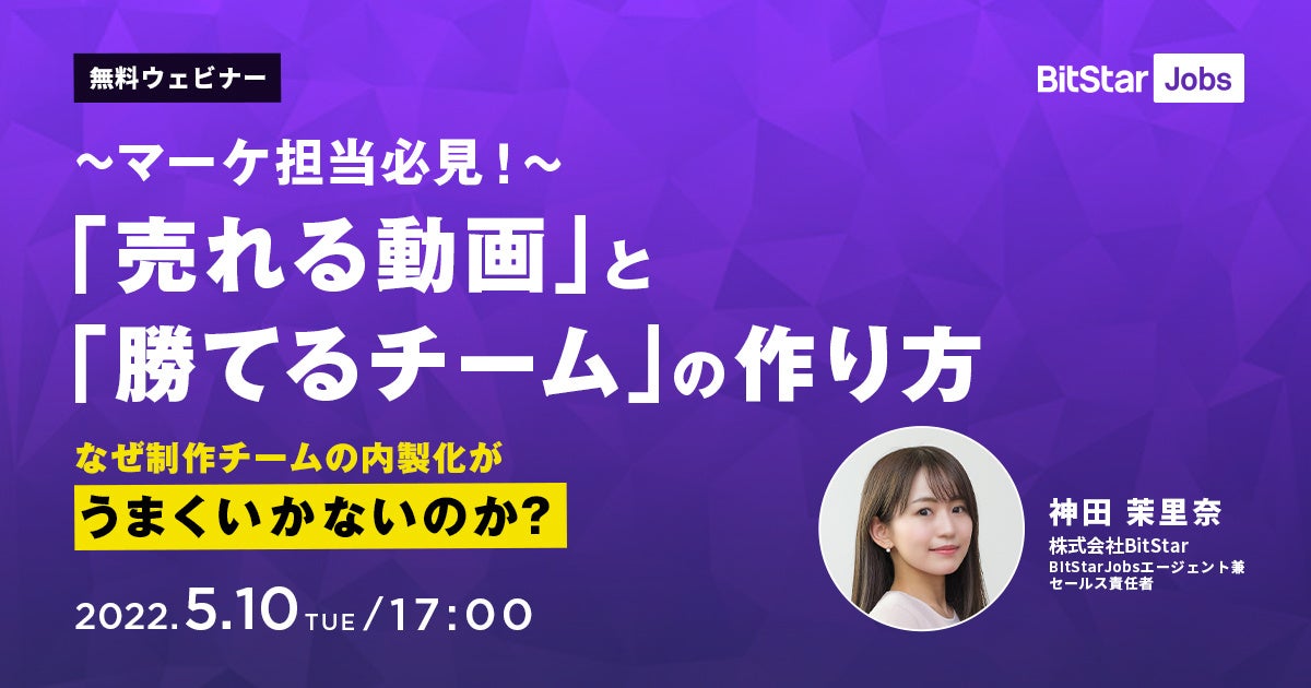YouTubeやTikTokを活用し、企業のマーケティングを多数サポートする株式会社BitStar(本社:東京都渋谷区、代表取締役 社長執行役員CEO:渡邉拓、以下BitStar)は、5月10日(火)17:00より企業のマーケティング担当者へ向けた無料ウェビナー「【マーケ担当必見】「売れる動画」と「勝てるチーム」の作り方。なぜ制作チームの内製化がうまくいかないのか?」を開催いたします。