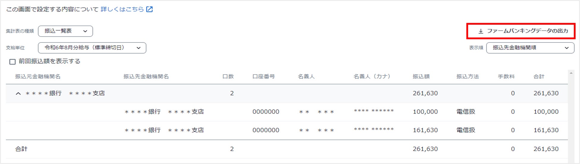 2. 振り分けた支給額をもとに振込一覧表を集計することができるようになりました。銀行振込業務のためのファームバンキングデータの出力が可能です
