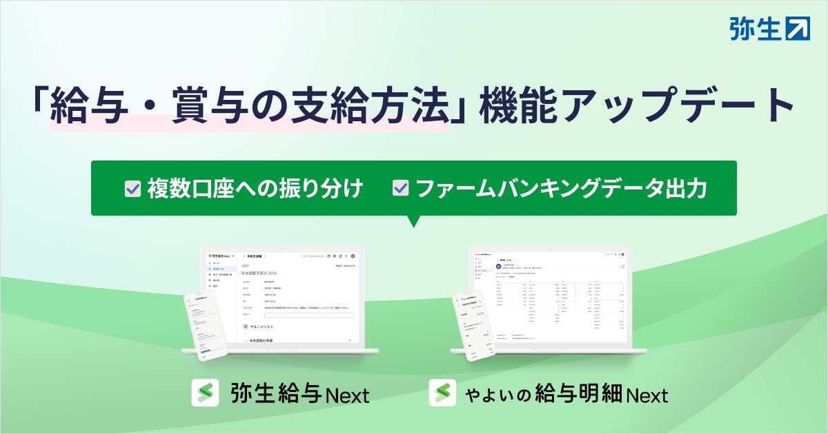 弥生株式会社(本社:東京都千代田区、代表取締役 社長執行役員:前山 貴弘、以下「弥生」)は、クラウド給与サービス「弥生給与 Next」および「やよいの給与明細 Next」において、給与・賞与の支給方法設定機能を新たにリリースしました。これにより、従業員ごとに支給先を複数設定し、給与や賞与を異なる口座へ振り分けて支給できるようになりました。また、ファームバンキングデータの出力機能も搭載し、銀行振込業務をスムーズに行えるようになりました。