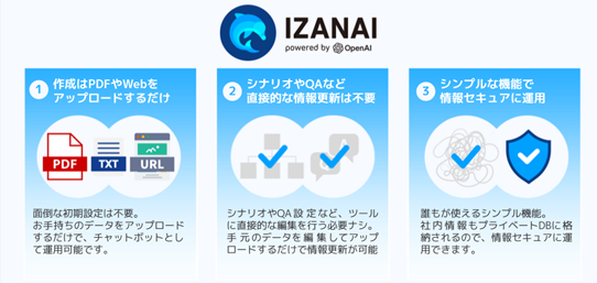 『IZANAI-OpenAI』は、PDFやURLを学習データとして登録するだけで、学習データに基づいた回答をするチャットボットが作成できるSaaSサービスです。これまで、チャットボットを検討したが初期設定の工数を理由に導入を断念した方、チャットボットを導入したけれど更新が滞っている方、何かAI活用を進めたいけど何から始めればいいかわからない方、これらの方々のお悩みを解決できます。