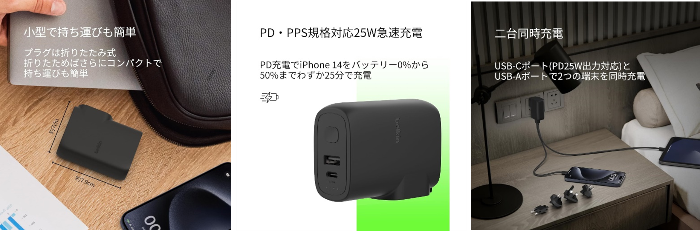 本製品は、モバイルバッテリーとしても使用できる、USB-CとUSB-A を搭載した超コンパクトなコンセント一体型充電器です。旅行先では、外出中はモバイルバッテリーとして20W出力可能でiPhone 14を25分で0~50%まで急速充電可能。ホテルに帰ってきた際には、充電器として最大25Wの電力供給ができます。 統合された PD3.0 &PPS テクノロジーにより、ほぼすべての USB および PD 対応デバイスに安全な高速充電が可能です。革新的な交換式プラグデザインは、ボタン一つでプラグを取り外し可能で、別売りの海外向けプラグを使えば、変換アダプターなしで海外で利用でき、ビジネストリップや旅行時の荷物を減らせます。