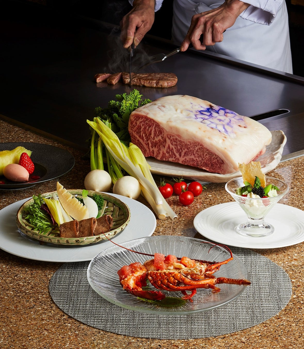 また、火入れすることで、弾力のある食感をよりお楽しみいただけるロブスターをはじめ、鉄板で蒸すことで美味しさが際立つ春野菜とともにご提供します。