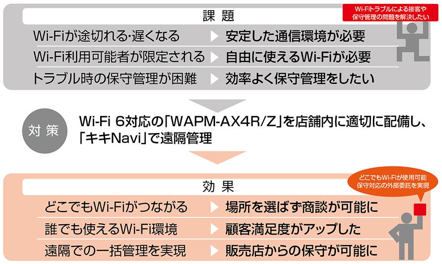 県内33拠点のWi-Fiアクセスポイントを刷新し、安定したWi-Fi環境を構築。「キキNaviクラウドゼロタッチ」で複数拠点の機器を一括登録・設定