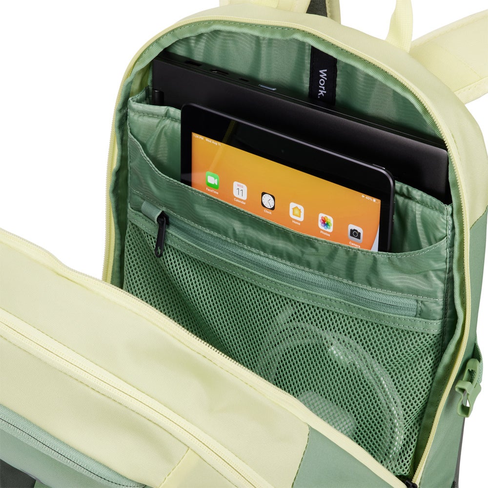 仕事道具とパーソナルアイテムを分けられるWork/Lifeコンパートメント*を装備。Work荷室はPC/タブレット、名刺⼊れやペン、書類などビジネスアイテムをまとめて収納。ハイブリッドワークで携⾏が増えるPCは15.6“まで対応し、厚⼿パッドとバッグを置いた時の衝撃を伝えにくい構造で持ち運びが安心。マチがあるLife荷室はジム用シューズや私物、耐水TPUポケット*はケア用品等、液体物の収納に最適です。バッグ内で乱雑になりやすいパーソナルアイテムを完全に分離することで、整理収納性とプライバシー性が向上。平日でもジムやスポーツ観戦といったアクティビティを充実できます。 *21Lモデルを除く