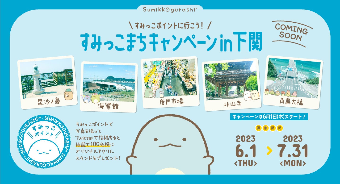 サンエックス株式会社(本社:東京都千代田区 代表取締役社長:千田洋史)は、2022年のすみっコぐらし10周年を記念した「すみっこでつながろうプロジェクト」の一環として実施している「すみっこまちコラボ」において、6月1日(木)から「すみっこまち」のひとつである下関にて、すみっこポイントで写真を撮ってツイッターで参加する「すみっこまちキャンペーン in 下関」がはじまることをお知らせします。