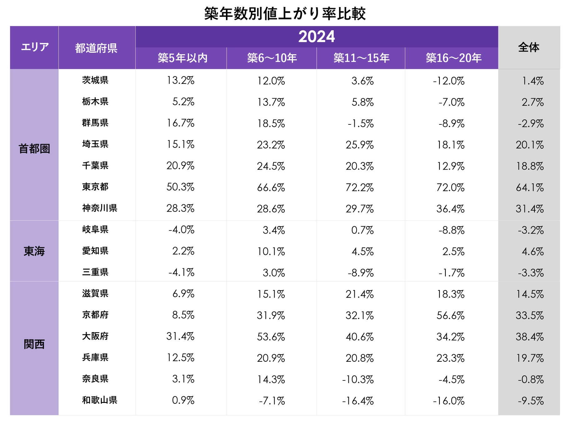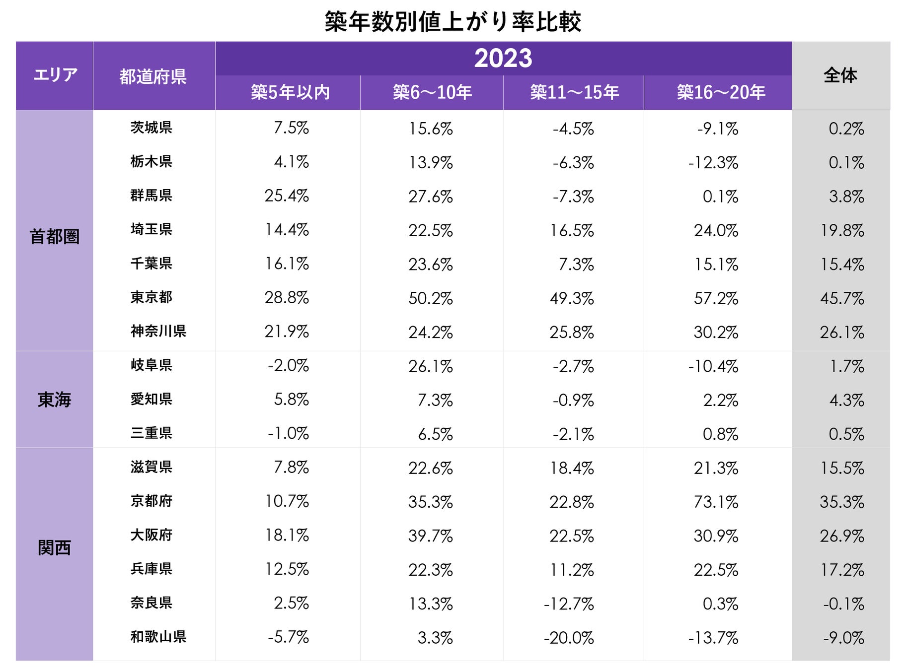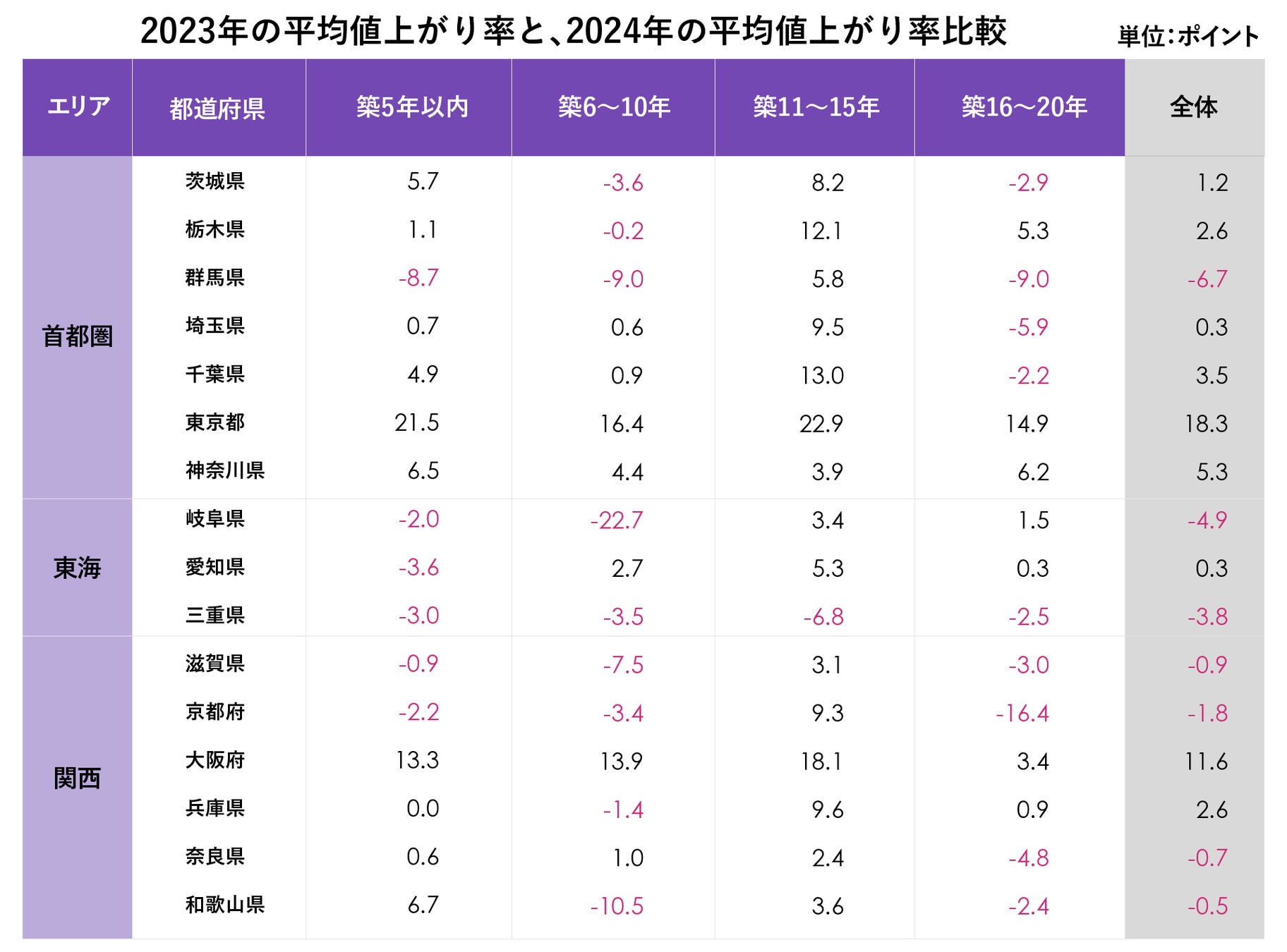 上の表は、都道府県別で築年数別の値上がり率を2023年と2024年で比較したものです。値上がり率が最も高いのは東京都で2024年の平均値上がり率が64.1%、2023年が45.7%で18.4ポイント上昇しています。次いで高いのが大阪府で、2024年が38.4%、2023年が26.9%で11.5ポイント上昇しています。