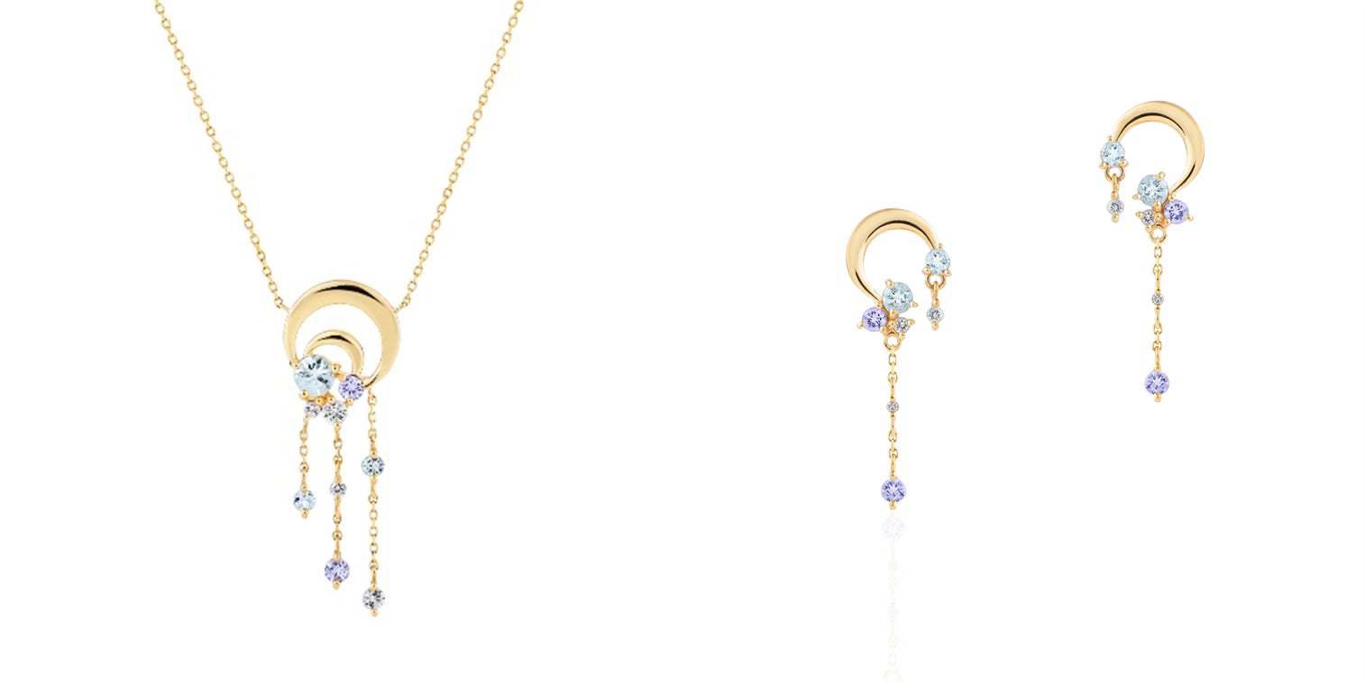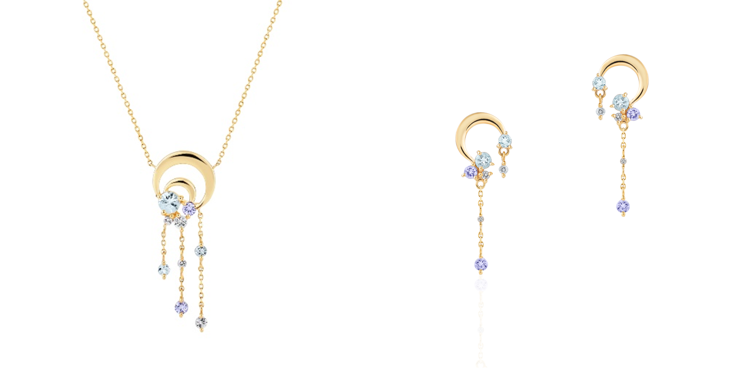 ゆっくりと優雅に広がる水の波紋からインスピレーションを受けた、ジュエリーがしたたり落ちるようなデザインのシリーズ。穏やかな波の広がりを感じさせる地金のラインに、透明感のある輝きが魅力のホワイトトパーズやアクアマリン、タンザナイトをランダムにセッティング。身に着ける人の動きに合わせて揺れ動く、上品さと大人の麗しい横顔を引き立てるジュエリーです。