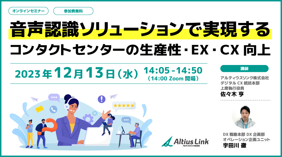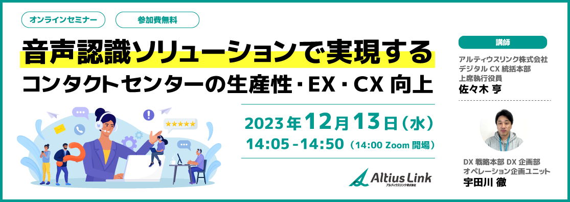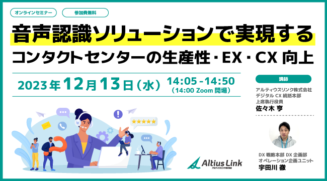 講師 | アルティウスリンク株式会社 デジタルCX統括本部 上席執行役員 佐々木 亨 DX戦略本部 DX企画部 オペレーション企画ユニット 宇田川 徹 |